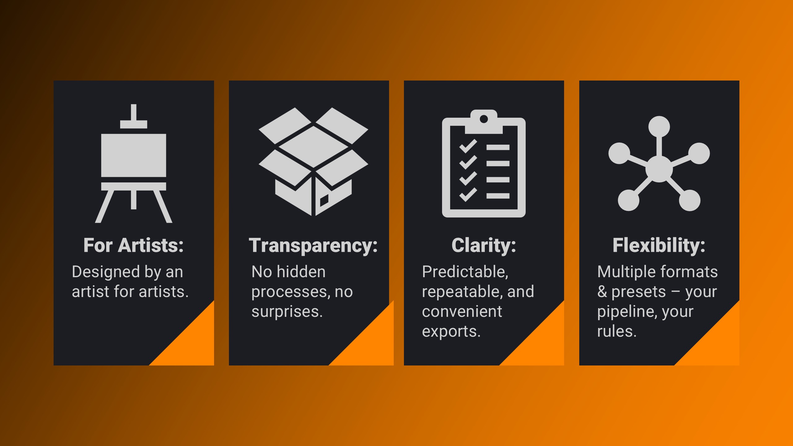 • Flexible & Scalable: Adapt presets to any project or pipeline—no rigid workflows.